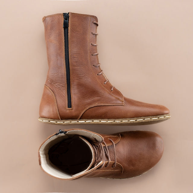 Wir bieten zwei Arten von Laufsohlen an: Leder und Gummi. Ledersohlen sind zu 100 % natürlich. Sie sind flexibler und weicher als Gummisohlen. Wir haben handgehämmerte Kupfernieten an der Unterseite angebracht, um statische Elektrizität vom Körper abzuleiten, wie beim Barfußlaufen auf Mutter Erde. Bitte beachten Sie, dass wir Kupfernieten nur an unseren Halbschuhen, Oxfords, Sneakers und Slippern anbringen können. Da im Inneren der Stiefel nicht genügend Platz zum Hämmern ist, können wir sie nicht an Stiefeln anbringen. Einzige Ausnahme sind Stiefeletten; diese sind mit Kupfernieten versehen.